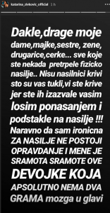 Katarina se osvrnula na to što je Stanija Dobrojević rekla da je Subotićeva izazvala Tomovića, pa je poslala javnu poruku na svom Instagram nalogu, čime je jasno stavila do znanja da ne podržava nikakav vid nasilja, a kamoli nasilje nad ženama.