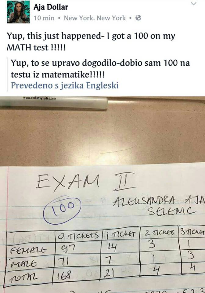 Naime, Aja je odlučila da, bez obzira što ima mnogo posla, a malo slobodnog vremena, nađe isto, kako bi završila fakultet. Da joj ide bolje, nego što se možda i sama nadala, dokaz je post koji je nedavno postavila, sa testom iz matematike, u kom je odnela maksimalan broj poena, tačnije rečeno, odradila je sve 1005 tačno.
