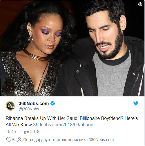 “To je bila dobra veza, ali sada je završena. Naravno, Rijana mu je slomila srce. To je ono što ona radi: slama muška srca. Rijana se umorila od njega. Ona se ponekad umori od muškarca”, kazao je izvor za ovaj medij.